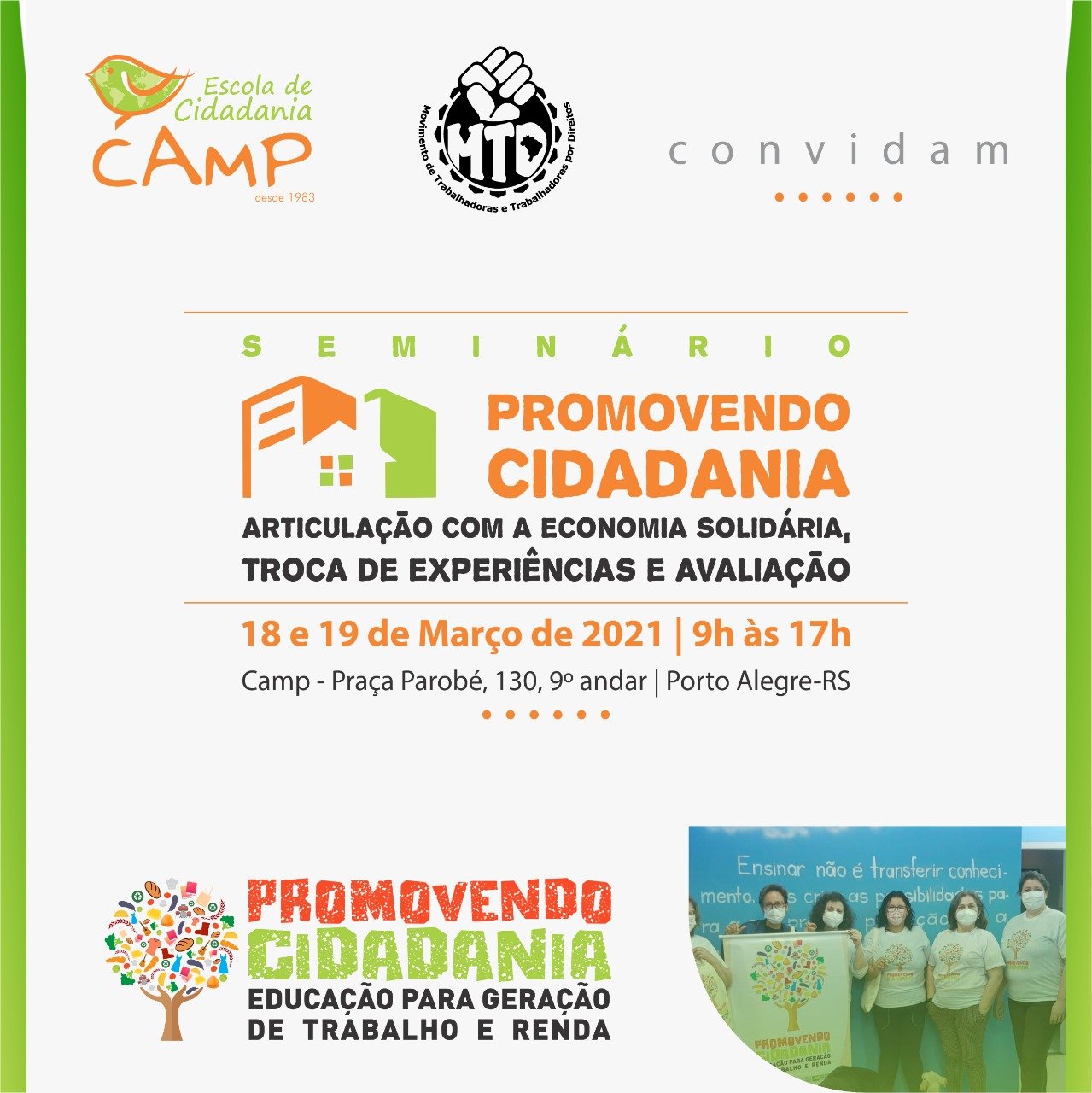 Dias 18 e 19 de março ocorrerá na sede do CAMP o Seminário e a Feira do Projeto Promovendo Cidadania: articulação com a Economia Solidária e troca de saberes. A atividade faz parte do projeto desenvolvido pelo CAMP em parceria com o MTD/RS, fruto de emenda parlamentar da deputada federal Maria do Rosário com o financiamento do Ministério da Cidadania – Departamento de Inclusão Produtiva.