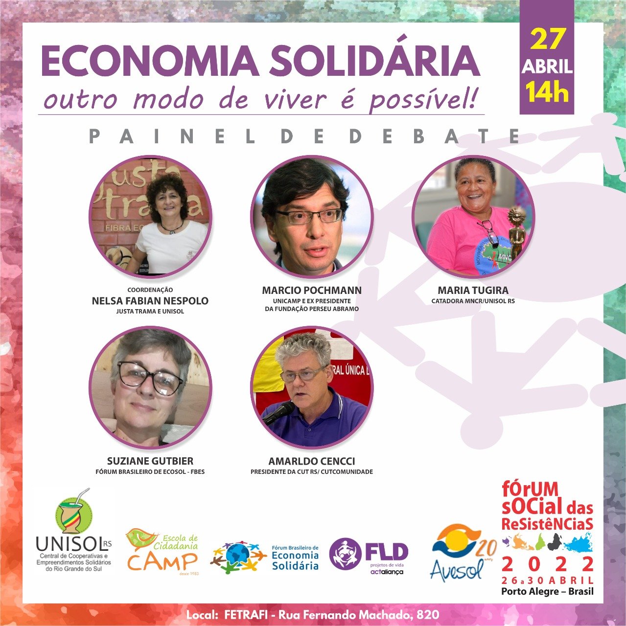 Destaques Notícias DaniTolfo 13.04.2022 0 Comentários Economia Solidária em debate no FSR 2022 O painel, Economia Solidária: outro modo de viver é possível ocorrerá dentro da Programação do Fórum Social das Resistências 2022 em Porto Alegre. 27 de abril, 14hs na FETRAF, Fernando Machado, 820. #EconomiaSolidaria