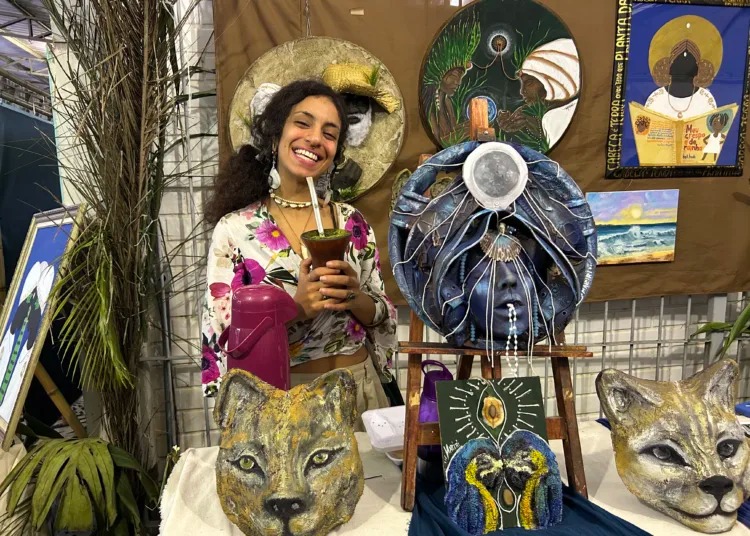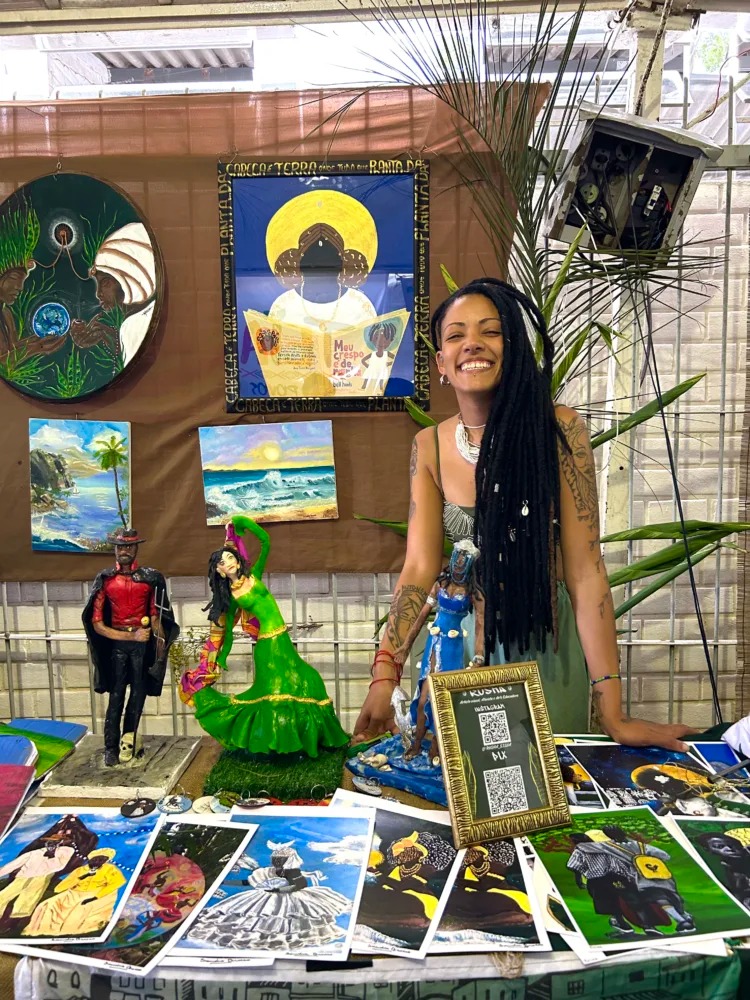 “Venho desenvolvendo esse trabalho há mais ou menos uns 10 anos, trazendo a fauna, a flora, os animais nativos do Brasil e também as mulheres como protagonistas”, contou. Suas obras dialogam com referências afro-brasileiras ligadas à fé e à espiritualidade, expressando, segundo ela, “a força da ancestralidade e as belezas do nosso território”.
