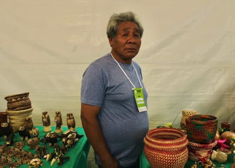 Morador da Aldeia Guaviraty Porã, em Santa Maria, o artesão Silvio Pereira Verá participou pela terceira vez da Feicoop – Foto: Clara Aguiar