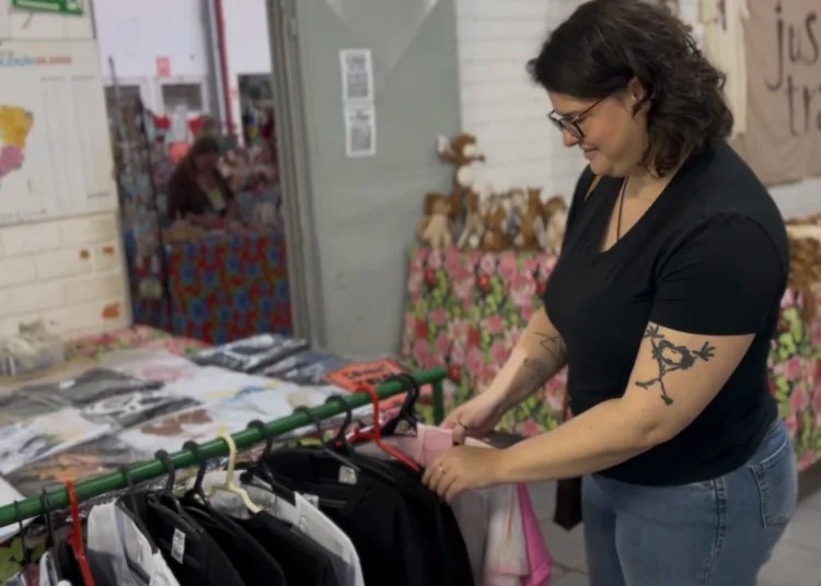 Paula Guedes de Azevedo, 36 anos, moradora da zona leste de Porto Alegre e integrante de uma associação de catadoras de materiais recicláveis, celebrou o retorno do grupo ao evento. “Estamos fazendo uma retomada importante aqui na Feicoop. Há mais de 7 anos os catadores não tinham mais um espaço na feira, e nós, mulheres catadoras do Movimento Nacional de Catadores de Materiais Recicláveis (MNCR), estamos nos organizando em nível estadual para ocupar esse lugar e trazer a importância do nosso trabalho à frente da logística, especialmente nesse contexto de mudanças climáticas. Buscamos a justiça de gênero dentro da reciclagem.”