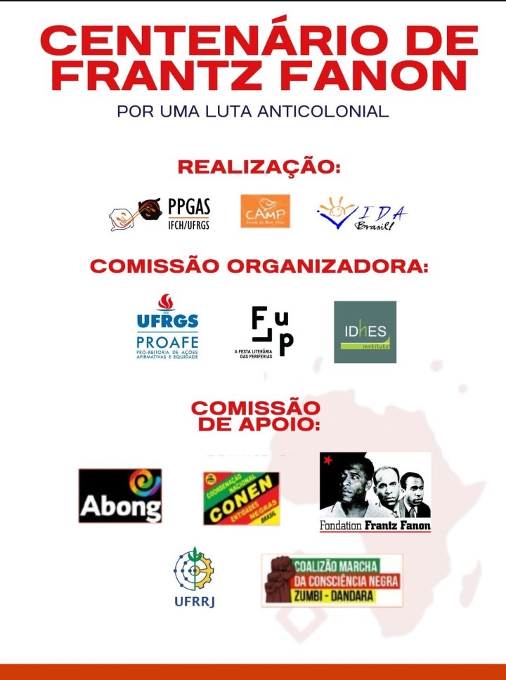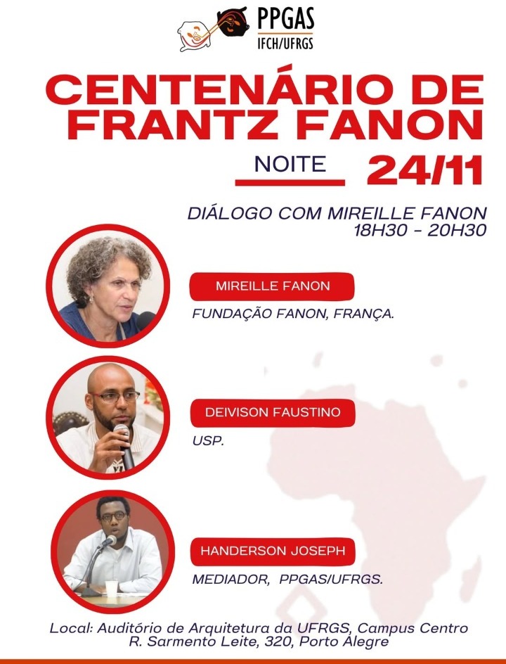 O Programa de Pós-Graduação em Antropologia Social da UFRGS, em parceria com outras instituições, convida a comunidade acadêmica e o público em geral para o evento “Centenário de Frantz Fanon: por uma luta anticolonial”, que ocorrerá no dia 24 de novembro, das 18h30 às 20h30, no Auditório de Arquitetura da UFRGS, campus centro, localizado na Av. Sarmento Leite, 320.