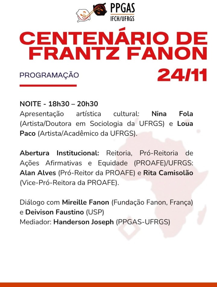 A programação contará com as apresentações artísticas de Nina Fola e Loua Paco, com a presença da Reitoria e Pró-Reitoria de Ações Afirmativas e Equidade (PROAFE/UFRGS), e um diálogo com Mireille Fanon (Fundação Fanon, França), filha de Frantz Fanon, e com Deivison Faustino (USP), e mediação de Handerson Joseph (PPGAS-UFRGS).